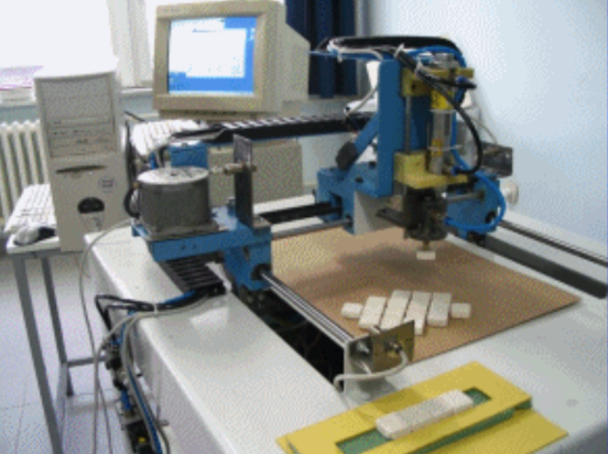 Bilgisayar denetimli dördüncü eksene sahip kartezyen robot ile herhangi bir 2D CAD yazılımıyla oluşturulan mozaik deseni için mermer dizme işlemi otomatik olarak yapılmaktadır. (E.P. İnal'ın Lisansüstü çalışması olarak gerçekleştirilmiştir.)